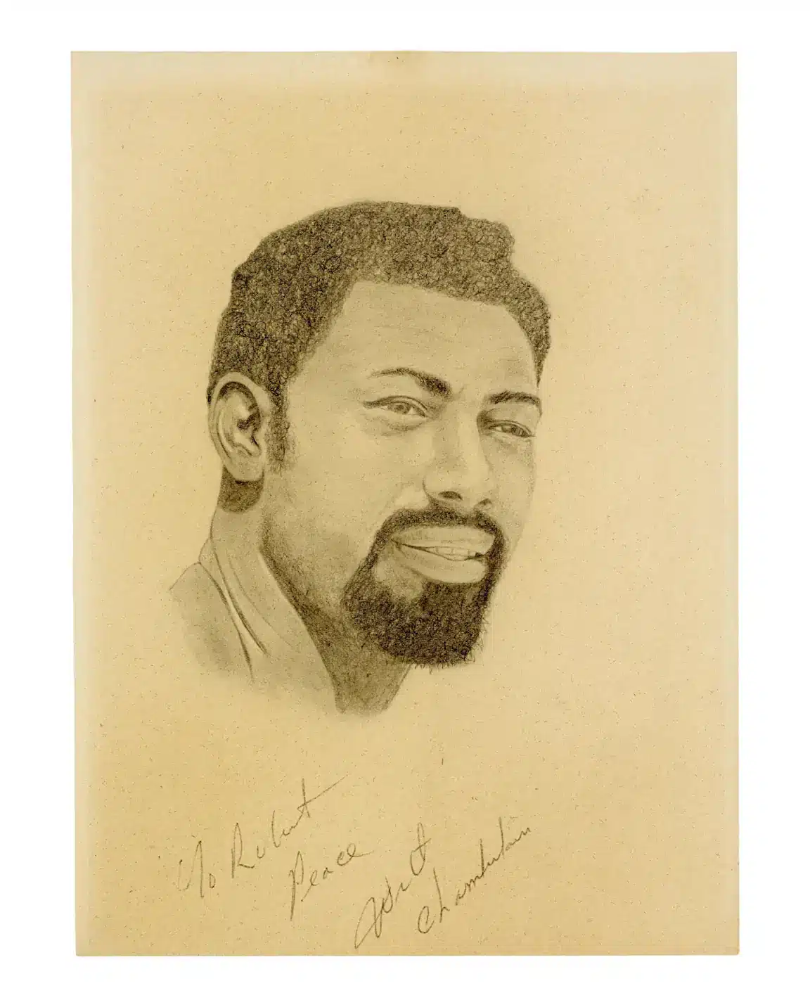 Measuring 8.5″ x 11.5″, this piece is more than just a portrait; it is a direct link to a basketball icon. This Los Angeles Lakers Wilt Chamberlain boldly signed and inscribed by the legend himself in black ink: “To Robert / Peace / Wilt Chamberlain.” Finding an authentic Wilt Chamberlain autograph on an original piece of fine art is incredibly rare, making this a cornerstone acquisition for those seeking high-end signed basketball collectibles.